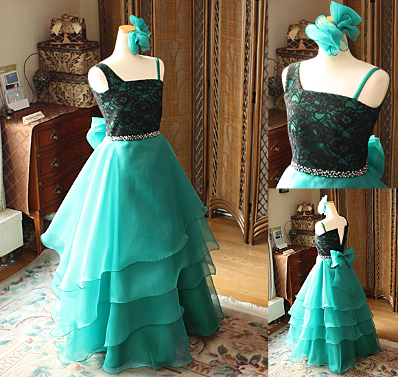 ”The Rabbit Closet”ザ・ラビットクロゼット 新作子供用ドレス デザイン! ”ピアノやヴァイオリンの演奏会、発表会、コンクール”などにぴったりなスレンダーAラインドレス。素敵なグリーンカラーと 上半身のブラックレース、ウェストには、細かいビジュを施した”新作 スレンダーAドレス”。 左右非対称!アシンメトリーデザインのスカート!大人らしいワンショルダー風のデコルテが中学生、高校生にぴったりなエレガント系ロングドレス。演奏曲やステージ上に、”上品な振る舞いと優...