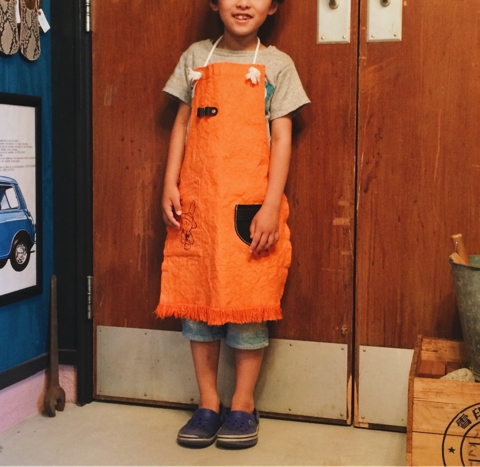 ビンテージエプロン・オレンジの着用例です。 キッズモデルの身長は124cm。エプロンの位置は首紐で手軽に調整可能なので、親子兼用で使えますよ。