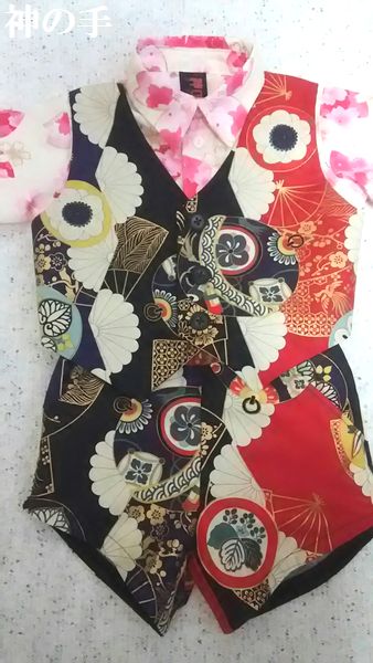 結婚式に出席できるようにと、男の子サイズ90の慶事用のセットアップのオーダーを頂きました(*^^)v 有難うございます☆ トップスはベストとシャツが一体型のレイヤード風シャツ! パンツは暑いこの時期向けのショートパンツにとのことで、そのようにお作りしました! それがこちら↑ 桜柄と家紋柄で上品かつかっこよくいなせな雰囲気になりました(^_-)-☆ お客様のお好み生地でこの組み合わせでお選びになりました! ばっちりな組み合わせ...