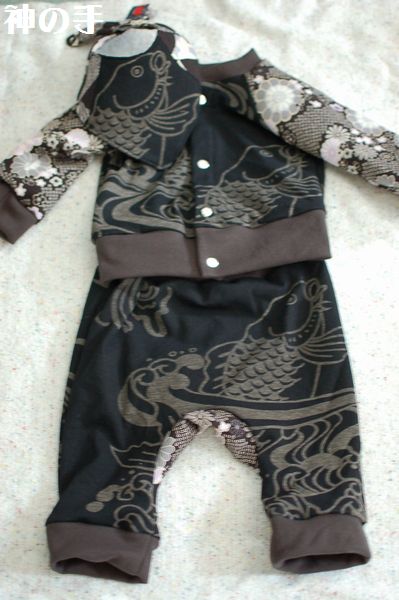 JUGEMテーマ:可愛い子供服&ベビー服 JUGEMテーマ:カワイイ☆カッコイイ☆子供服 海外のベビーのご出産祝いに神の手の和柄服セット&スタイをオーダー頂きました(^^) 有難うございます! 黒地に鯉柄の渋カッコイイ雰囲気でご希望でしたので、その様にお作りしました! 可愛い小さい赤ちゃんに渋め和柄服はとっても良く映えて可愛さ倍増になります☆ スタイも服とお揃い、共布で仕立ててます。リバーシブル(^_-)-☆ 長い期間着て頂けますので、サイズアウトするまでヘビロテして欲しいです。 オーダー頂き、有難う...