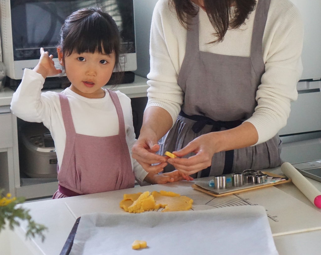 JUGEMテーマ:可愛い子供服&ベビー服 ママとお揃いのエプロンを着て 一緒にクッキー作り ママはグレー キッズはピンク お揃いだといつもより頑張れちゃう