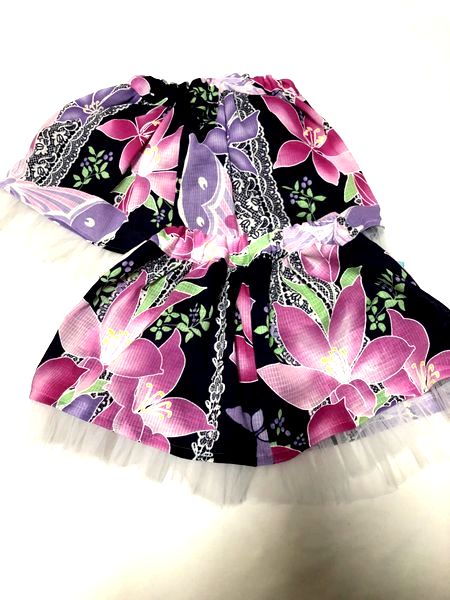 ママの和柄甚平と浴衣より娘様達の物へとリメイクのご依頼を頂きました(^^) ありがとうございます! 着なくなった甚平と浴衣が有るとのことで、当方の元へお送り頂き、 ご希望の後ろリボン付きスカートとマフラーにリメイク。 後ろリボン付きスカートの本体はママの浴衣、リボン部分はママの甚平です。 裾にチュールを付けのもご希望でした。 スカートを2点作ってもまだ他の物も作れそうでしたので、マフラーとシュシュも2点、 ご姉妹でお...