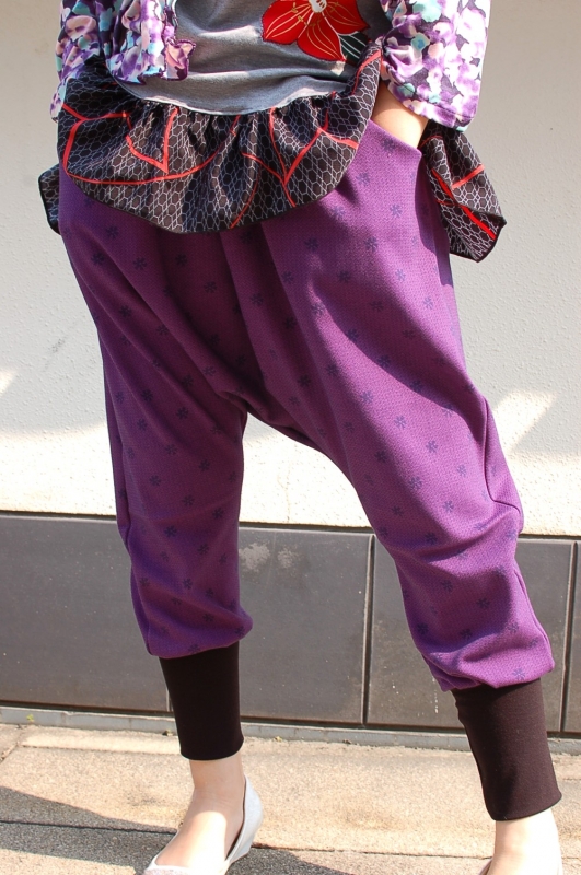 【即納】特別価格!シック小紋柄ニット地のサルエルパンツ ベビー,キッズ,レディース,メンズ 上品な小紋柄がとても素敵な柄生地で、サルエルパンツを仕立てました(*^^*) 是非とも穿いて頂きたいので特別価格にて販売してます。 生地自体に伸縮性が有りますので、大変穿きやすく、穿き心地も良いです。 プリントではなく、織り柄でとても上質感が有る生地です。 生地は薄くなく、しっかりした生地厚なので、透け感なく、年中穿いて頂けます。 ウエスト、裾は黒のニット生地で...