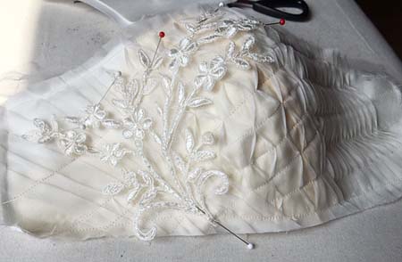 細かい細工!ドレスの施す装飾品。 トップスやウェスト周りを輝かせる”ハンドメイドのビーディング作業”。 ビーディングだけはミシンで縫うことができません。 主に上半身のレースの上に施す装飾品やウェスト周りに施すビーディングのサッシュベルトなど糸を通して一針一針縫う作業。配色やハイライトを効かせるビジューの大きさ、種類などを含めてバランスを整えながらの作業です。本当に時間のかかる作業ではありますが”美しく素敵な輝きを放つドレスに仕上がります”。デザインコンセプ...