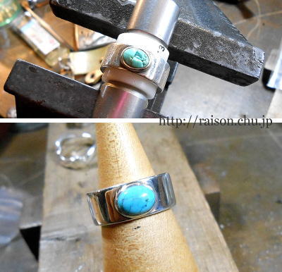 JUGEMテーマ:ジュエリー・アクセサリーの修理&カスタムリフォーム よく来て下さるお客様が長年愛用しているリング。ターコイズが留っています。ずっと前に割れて、欠けたまま使っていたので新しい石を入れたいというご依頼でした。 ターコイズはご希望通りなるべく色の近い、模様の少ないもので探しました。 同じサイズのものが見つかりましたので、外して留め直し。。。ついでに指輪自体もできるだけの傷抜きと、新品仕上げ。料金は石代も込みで 4,500yenでした。 悪い事があると身代わりになって砕ける。と言われてい...