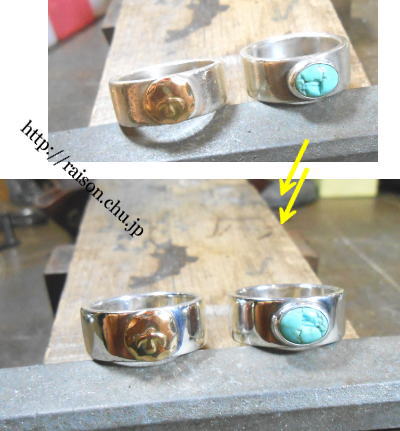 JUGEMテーマ:ジュエリー・アクセサリーの修理&カスタムリフォーム アーマーリングのサイズ直し、今回はガンメタメッキが施されたものでした。 大き過ぎるので小さく直したのですが、切って繋ぐにはバーナーを使用します。高温の炎で炙りますから、最後の仕上げに再メッキが必要になります。 うちでお願いしている外注さんでは、黒系のメッキは四種類ありました。最初の色と雰囲気が変わる可能性もありますので、お客様には先にその旨をご説明して、OKをいただいてから指輪をお預かりしました。 工賃は上下のリングのサ...
