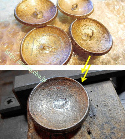 JUGEMテーマ:ジュエリー・アクセサリーの修理&カスタムリフォーム ※12/31〜1/4 までお休みをいただきます。 レプリカではなくて、本物のモルガンコンチョ。ベルトに付いていたものだそうですが、丸カンが千切れてしまっておりました。強度が増すように直したいとのご希望で、県外からメールと郵送でお預かりしたものです。 丸カンは細い銀線で作られていて、盛りまくったハンダに埋め込むようにして固定されていました。 抜けたり千切れたりしていたのですが、まずはハンダの除去作業。低温で溶けるのがハンダの手軽で良...