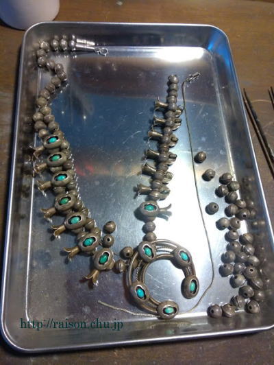 JUGEMテーマ:ジュエリー・アクセサリーの修理&カスタムリフォーム ワイヤーの切れたネックレスを直しました。年季の入った渋い逸品、お世話になった門蔵商店の江口さんのもの。ワイヤーをしっかりと繋いでバラバラになったパーツを組み直して仕上げました。個人的にもインディアンジュエリーが好きです。 ワイヤー交換ではなく、修理で3,000yen+TAX。どちらにしろ金額は同じくらいです。ネックレスのデザイン的にワイヤーの切れるポイントは決まってきますが、今回繋ぎ直したところはビーズの中に隠れるので外から見えま...