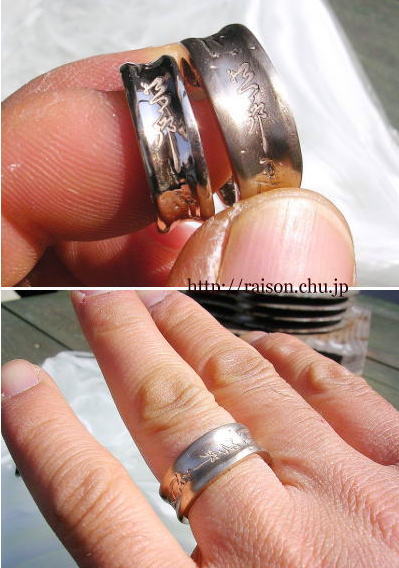 JUGEMテーマ:オリジナルジュエリー・アクセサリー 時々ですがこちらでもオーダー作品を紹介していこうと思い、まずはお気に入りのこの作品から。 奥様が書道をされていて、確か二度目のご来店の時に毛筆で書いた文字を幾つか、お持ちになりました。その中から一番良く書けていたものをそのまま縮小して、彫り込みたいとのご要望でした。 方法は幾つかありましたが、この時はレーザー彫りを選択しました。指輪自体からも和のテイストを感じるように、ナチュラルな凹凸を意識したり色々と工夫したのを覚えています。 また、生...