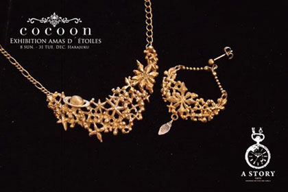 コクーン アクセサリーエキシビジョン ~amas d´étoiles~ 8 SUN. - 31 TUE. DEC. Harajuku 2013/12/8〜12/31 A STORY TOKYO 原宿本店 コクーンのアクセサリー通販はこちら 作家在店日 12月8日(日) , 21日(土) , 22日(日) 原宿本店 cocoonとは繭の意。 繭のように優しく 着ける人の気持ちと身体を包み込み、飾りたい。 『人の心を包み込み満たすもの』がテーマ 着ける人がワクワクした、楽しい、幸せな気持ちで満たされますように。 日々の生活の中から切り...