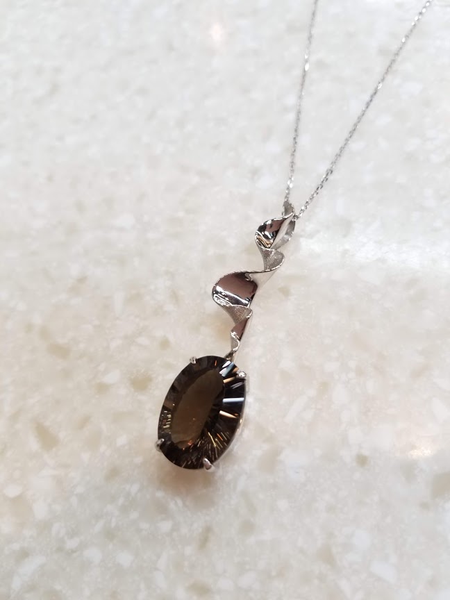 JUGEMテーマ:ジュエリー スモーキークォーツのペンダントが出来上がりました オーロラの様なデザインにクォーツを付けてみました 大き目の石はチェーン通し部分にアクセントをもってくると、楽しいデザインに仕上がります シンプルでスタッフもお気に入りのペンダントです 装飾用のメレダイヤが入らなくてもキラリト輝くデザインになっています プラチナート 仙台宮城野区榴...