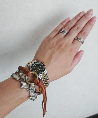 JUGEMテーマ:ジュエリー 最近、ブレスレットが気になります 今まで、あまり着けなかったので ほとんど持っていませんでしたから ネックレスで代用(シルバーの方)したりしてます(^▽^;) なんで急に気になり出したかと言うと 大汗をかくようになったから(^▽^;) 去年までは「二の腕が・・・」などと言って 躊躇していたノースリーブも 「そんなん言ってられない!」と 暑さと汗に負けて、今年はガンガン着ております。 ...