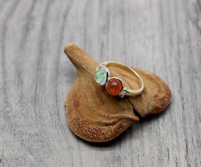 水と火。メキシコ産のウォーターオパールとファイアオパールのコントラストがユニークなリング。 もとは対照的な、ウォーターオパールの涼しげな雰囲気とファイアオパールの情熱的な色合いが相まって、とても個性的なリングになっております。 最近はエチオピアのオパールを多く見かけますが、地色の多様さや透明感等やっぱりメキシコオパールの方が魅力的だと思います。