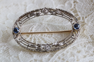 JUGEMテーマ:ジュエリー サファイヤ&ダイヤ オーバルブローチ K18/ K18WG 美しいサファイヤと、メレダイヤをあしらい 繊細なモチーフで飾られているオーバル型のブローチです。 表はホワイトゴールド、裏はゴールド・・・ 縁の作りもこだわりでしょうか・・・ 本当に素敵で、見入ってしまいます。 スキッパーカーディガンを真ん中で留め...