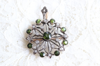 JUGEMテーマ:ジュエリー トルマリン&ダイヤモンド ブローチペンダント グリーン色のトルマリンと、メレダイヤのブローチ兼ペンダントトップは 今回のロンドンで運命の出逢いでした。 マテリアルはK18とグレードも高い逸品です。 その細工の美しさと、バチカン金具の取り外しができることも 今まで見たことがありませんでした。 細部までミルうち加工の入る職人技...
