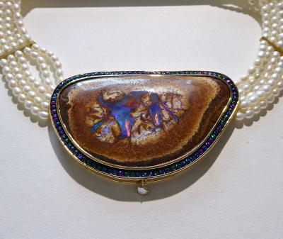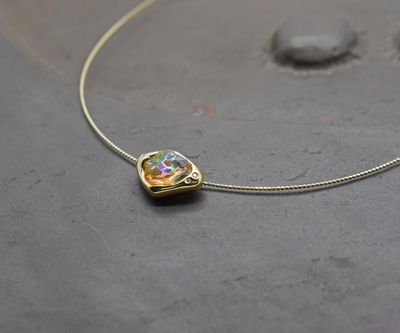 とても綺麗な遊色効果のでるメキシコオパールのペンダントです。 ナチュラルなラフカットオパールの自然な魅力が生きるように、周りのイエローゴールドも柔らかい雰囲気で仕立てました。 オメガタイプのチェーンとの組み合わせも人気があり、華やかでありながらもスッキリとしたデザインになってますので、様々なシーンでお使いいただけるペンダントです。