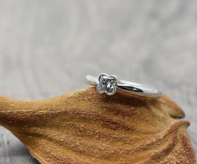 オーダーでお作りしたブライダルリングです。 リリーカットと呼ばれているカットのダイヤをダイヤの形がよりはっきりと見えるように覆輪で留め、落ち着きのあるデザインで作りました。