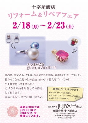 本日2月18日(月曜)より23日(土曜)まで 十字屋商店店舗にて、リフォーム&リペアフェア開催しております。 十字屋商店では「まいにちジュエリー」を意識しております。 「まいにちジュエリー」とは何か? まずは、いろんな方にジュエリーをまいにち使っていただきたいと願っております。 また、ジュエリーってなにか?と考えますと 誰かやなにかとのつながりを思い起こさせるものかなと思っています。 ジュエリーを買う背景には、なにかストーリーが...