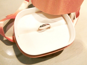 シンプルなマリッジリング(結婚指輪)にダイヤモンドを 入れてポイントを付ける・・・というリメイクのご相談でした。 シンプルでプレーンなプラチナのマリッジリング(結婚指輪) にダイヤモンドを埋め込みました。 3個! こちらです。ホワイト&ブルー&ピンクのダイヤモンド。 ブルーとピンクはホワイトよりも少し小さめです。 でもしっかり存在感が出ています。 奥様の分といっしょに並べるとこうです。 今回は男性の方のご依頼でした。なのでリング幅目一杯に 入れないでさりげなく。 いかがでしょう...