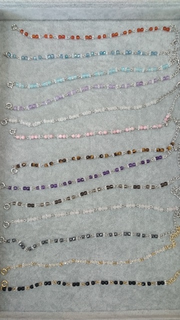 JUGEMテーマ:天然石 新しいアンクレットが出来上がりました これで4種類めですが、一番キラキラしてる感じです(*^-^*) 暑くなれば男性も女性も、ジーパンやスカート等の下に履くのが短くなると思います その時の足元のアクセントにいかがでしょうか? 天然石のアンクレット等を販売している店は少ないので、気になる方は是非御来店下さいませm(__)m