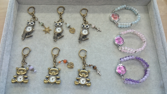 JUGEMテーマ:天然石 新しく制作した時計を紹介します ・パワーストーンのブレスレットに時計を取り付けた腕時計 アクアマリン×水晶 ローズクォーツ×水晶 アメジスト×ラベンダーアメジスト 此方は6mm玉の2連になります まだ時計本体が3つありますので、オーダーで制作できます ・キーホルダーの時計 バードが3つとベアーが3つになります ベアーはネックレスにもなりますので、キーホルダーかネックレスを選んでいただくことになります 良い時計本体がなかなか見つからないので、次に作るのが...