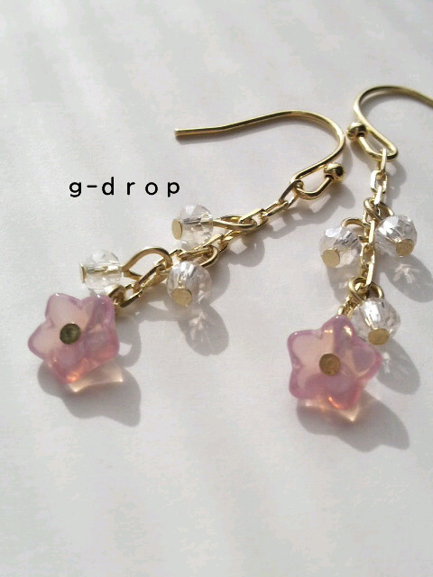 JUGEMテーマ:ハンドメイドアクセサリー JUGEMテーマ:オシャレ★大好き JUGEMテーマ:大人可愛い* アクセサリー こんにちは! 新作のピアスが、 完成致しました☆ 早速ご紹介させていただきます!!! (*^▽^*)/ ** 春の雫 ** いち早く春を届けてくれそうな、 ピュアな雰囲気のピアスを作りました! 桜のような淡いピンク色がカワイイ☆ チェコガラスのお花のビーズと、 みずみずしい雫をイメージした透明のカットガラスビーズを合わせて、 繊細で大人可愛く仕上げました♪ 春の風に乗って、 ゆらゆ...