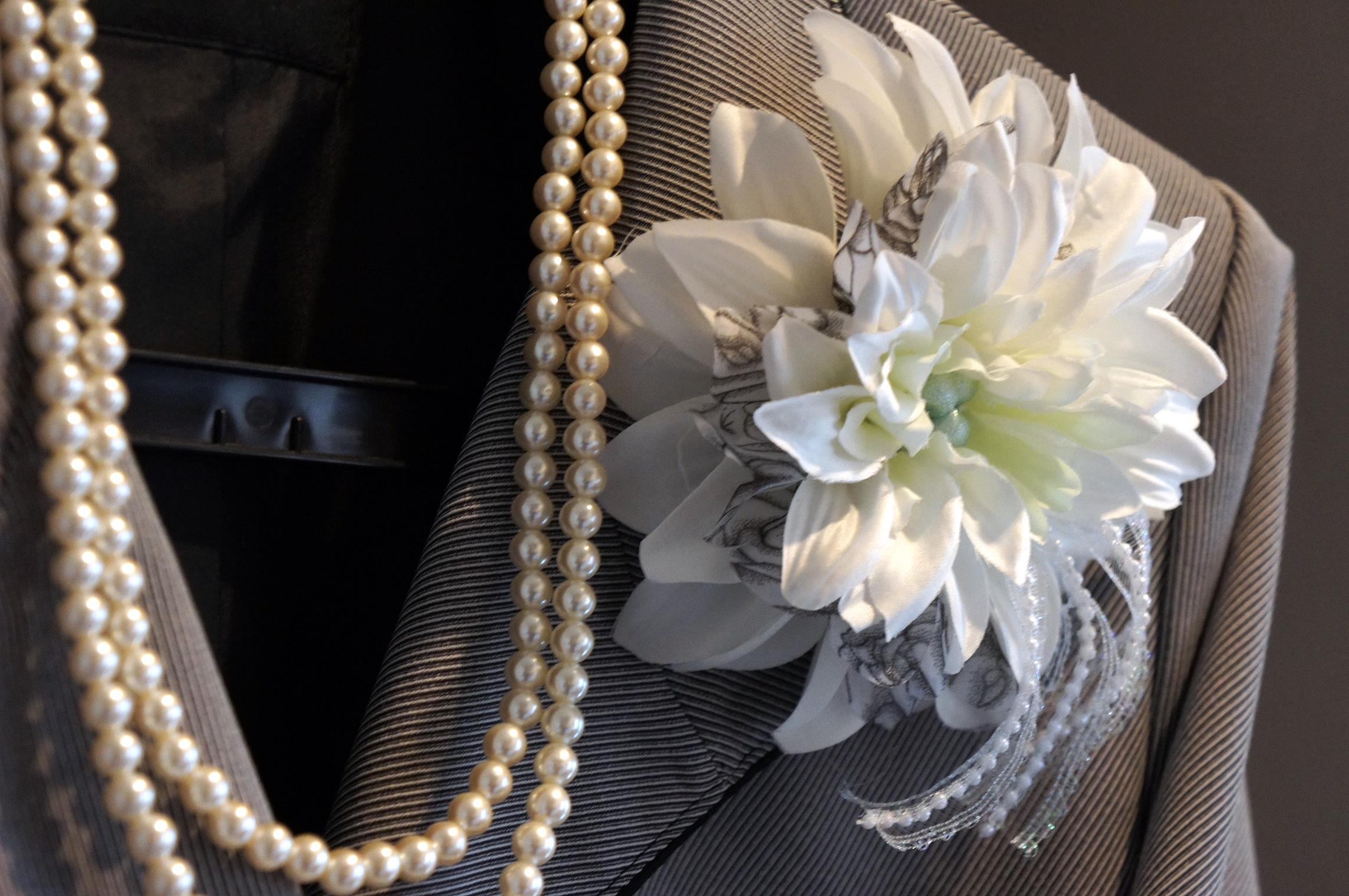 前回の白ダリアのコサージュを、少しフォーマルで着けられるように気持ち華やかにしてみました。 ジャケットに着けてみると、かなりいい感じです。 この白ダリアコサージュ、大きくて綺麗で本当に気に入ってます。 <白ダリア><ラナンキュラス><プリーツジョーゼットリボン>のコサージュは Fabric BLUE(ファブリックブルー)さんへ納品しています。 Fabric BLUEブログ→http://plaza.rakuten.co.jp/hoho731/diary/201602030000/ ところで、 Fabric BLUEさんへ納品した時にちょうど...