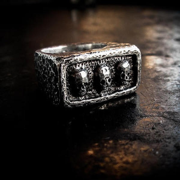 JUGEMテーマ:シルバーアクセサリー 朝起きると酷い頭痛に襲われ、なんだ?…と思いきや、多分ただの熱中症な私。 アクエリアス、アクエリアス!と思いながらカフェオレを飲み。 頭痛は治まりませんが… 今日も平和でしたね。 本日も素敵な商品をご紹介させて致します。 Blackbeard Jewelryから 'Three' Skull Bone Ringdです。 Blackbeard Jewelryらしいアンティーク感たっぷりのスカルが3つ並んだリングです。 一見可愛い感じのリングですが、...