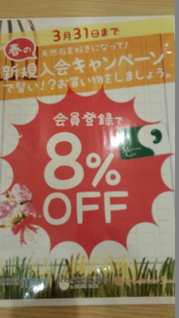 JUGEMテーマ:彼氏・彼女への誕生日プレゼント・クリスマスプレゼント・バレンタインやホワイトデーギフトにコレ! JUGEMテーマ:天然石アクセサリー JUGEMテーマ:天然石・原石・ルース JUGEMテーマ:おしゃれアクセ&雑貨S/S イオンモール和歌山 〜ブログ更新中〜 ゜+。。☆。。★。。☆。。★。。☆。。★。。☆。。+゜ 当店のポイントカードをお持ちでないお客様必見!! 当店ポイントカード 新規入会キャンペーン 3月16日〜3月31日まで ポイントカードの即時発行で 店内商品8...