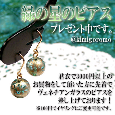 JUGEMテーマ:ピアス♪リング♪ネックレス♪ 新しいプレゼント企画がスタートしました! 本日18時より、当店で3000円以上のお買い物をして頂いた方へ 先着で「緑の星のピアス」を贈らせて頂きます♪ (プレゼントサービス対象外の一部商品にご注意下さい) まるで宇宙に浮かぶ地球のようなヴェネチアンガラスを フックタイプのシンプルなピアスに仕立てました。 イヤリングにご変更も可能ですので、 ご希望の方はご注文画面の備考欄にご記入下さいませ♪ 尚、恐れ入りますがご用意数に限りがございます。 目安としまして...