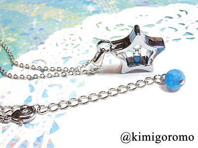 JUGEMテーマ:ピアス♪リング♪ネックレス♪ こちらは昨日アップしたプチギフト・アクセサリーの新作です! お星さまの形をした砂時計をチェーンに通して シンプルなネックレスに致しました。 チェーンの先端には、キレイなグラデーションの青いビーズを配して 首の後ろにもワンポイントが来るようになっています。 直径がわずか1.5センチほどしかない小さな砂時計ですが、 模型ではなく、ちゃんとガラスの中を青い砂が落ちていきます♪ ひっくり返して砂が全部落ちるまでの時間は、 流れ星が通り過ぎるくらいの間でし...