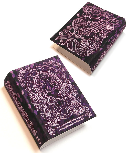 JUGEMテーマ:ハンドメイドアクセサリー 新装版の魔法書ペンダント「ネバーランド浪漫紀行〜人魚の口説き方」のサンプル第一号ができあがりました! 新作をはじめて製本する時はいつも、柄の細かい線がつぶれて何が描いてあるのか分からなくなったらどうしようとハラハラしますが、ちゃんと印刷できそうでとりあえずほっとしています。 写真はサンプルの中で一番出来の良かったものなのですが、それでももう少し柄ははっきり出したいので、線を太くしたりこれからまた微調整していきます。色もこれだとちょ...
