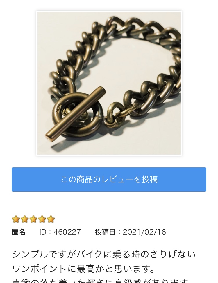 真鍮製チェーンブレスレットのレビューをいただきました。ありがとうございます! シンプルですがバイクに乗る時のさりげないワンポイントに最高かと思います。 真鍮の落ち着いた輝きに高級感があります。 ソリッドブラスブレスレット / Mサイズ(SOLID BRASS BRACELET / M) 商品を購入してくださったお客様からレビューをもらえるというのは、モノづくりをしている者としては本当にありがたいです。そして自粛傾向が続く中、店頭でお客さんから感想を聞く機会も減ってし...