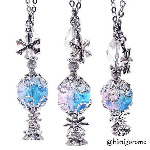 JUGEMテーマ:ハンドメイドアクセサリー 初売り企画を終えましたところで本日は、完売していた小瓶ネックレス「No.115」のリニューアル版をアップしました! 雪の結晶をモチーフに取り入れたNo.115は、ちょうど今頃の季節のコーデに合わせて頂きたいナンバーです。下写真は旧デザインですが、ブルーとピンクの2色展開から、その2色を合わせたグラデーションカラーの瓶に生まれ変わっております。 また、No.200以降からチェーンの長さが変更になりまして、こちらも新作扱いでチェーンは50cmです。お洋服の...
