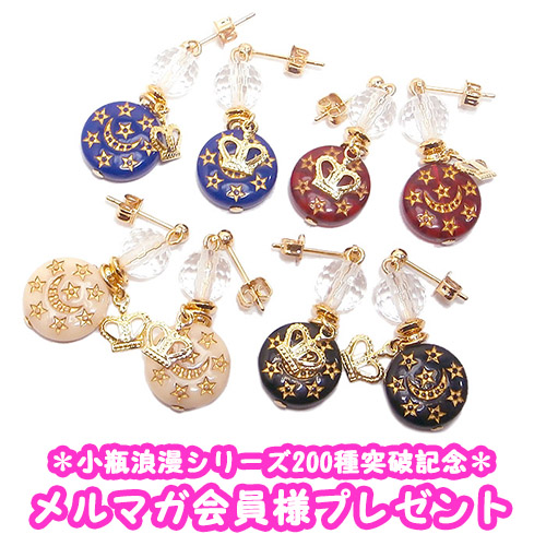 JUGEMテーマ:ハンドメイドアクセサリー 気づけば一月ほど前になりますが、当店の看板作品「小瓶浪漫シリーズ」が200種類の大台に乗ったのを記念して、遅ればせながらプレゼント企画をご用意させて頂きました!改めて、長らく本シリーズを支えて頂いた皆様に感謝致します! この週末に小瓶ネックレスをお求め頂いた方に。本日発行のメルマガに記載されている「魔法のじゅもん」をご提示頂きますと、上写真の小瓶ピアスを差し上げます♪星と三日月の模様が描かれた、マジカルなパワーが宿りそうな小瓶...