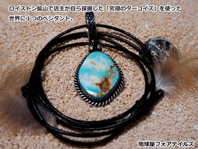 JUGEMテーマ:天然石・原石・ルース JUGEMテーマ:ハンドメイドアクセサリー 「究極のロイストンターコイズ ペンダント」 誰かがどこかで「採掘」した石ではなく、地球屋フォアテイルズ店主自らの手で、USAネバダ州にて、2011年11月4日14時(USA時刻)に、ロイストン鉱山主らと共に、地球から掘り出されたターコイズ原石。誰かがどこかで「研磨」したターコイズ カボションではなく、地球屋フォアテイルズ店主自らが削り出し、バッキング処理を施した究極のロイスト...