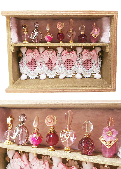 JUGEMテーマ:ハンドメイドアクセサリー 11月7日の記事でもご紹介させて頂いた、ミニチュアの香水瓶コレクションを引き続き制作中です。 シルエットの違う小瓶を7種そろえるのにちょっと時間がかかりましたが、ピンク色で統一したガーリーなセットができました!ここからもっともっと飾りつけしていきます♪ 全体のデザインはだいぶ固まってきたものの、初挑戦のアイテムなので段取りが悪くて、こっちを先にくっつけなきゃ駄目じゃん!とか、これ乾燥するまで次のことできなくない?とか諸々出てきまして、...