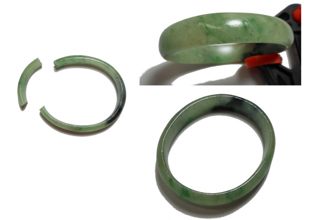 ヒスイバングルの割れを紹介します。オナー様は、ヒスイバングルに対しまして、とても思い入れが有り大切に大切に使っておりましたが、ある日突然に手の間をするりと滑り落ちまして床へその瞬間に2つのパーツに別れました。とても悲しい気分になり奈落の底へ落とされた様な気分になりました。 なんとしても直して再びご自分の腕に再び着ける思いでスマホの検索を必死に探しまして、私共へたどり着きました。お客様の思いをお伝えくださいまして、修理のご依頼となりました。 私共は、修理は接着によります修理になります事、また...
