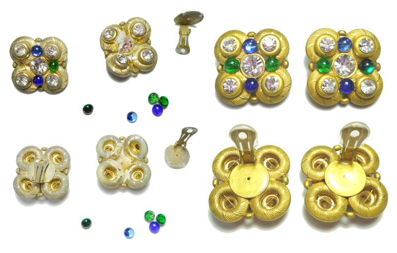 イヤリングの修理を行いました。ご依頼頂いた時は、仕上げ直しでメッキをつければ良いと思いましたが、詳細に拝見しますとプラスチック等のビーズにメッキを施した商品で出来ておりメッキが剥げているのと、イヤリングのパーツが取れてしまっています。再びメッキをつけることは不可能ですので、塗装によります仕上げで再びイヤリングを再生することになりました。壊れております方は、可能な限り残っております接着剤を除去します。再び接着剤にて組み立て後表面を綺麗にするため下地を塗装しまして、金メッキに近い塗装を何層か行い...