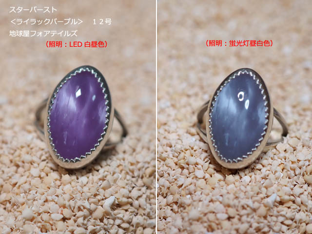 https://skystonejp.com/JUGEMテーマ:天然石・原石・ルース JUGEMテーマ:ハンドメイドアクセサリー スターバースト<ライラックパープル>は、光源が蛍光灯(昼白色)下では、シルバーに見えることがわかった。人工石だが、不思議な話だ。 比べてみれば、一目瞭然。 色の変わる石。ブラックライトなどではなく、通常の室内灯で。だ。 なんか、凄い・・・w ・・・にこの2点を付けての福袋!!! リングサイズの変更はできないものの。...