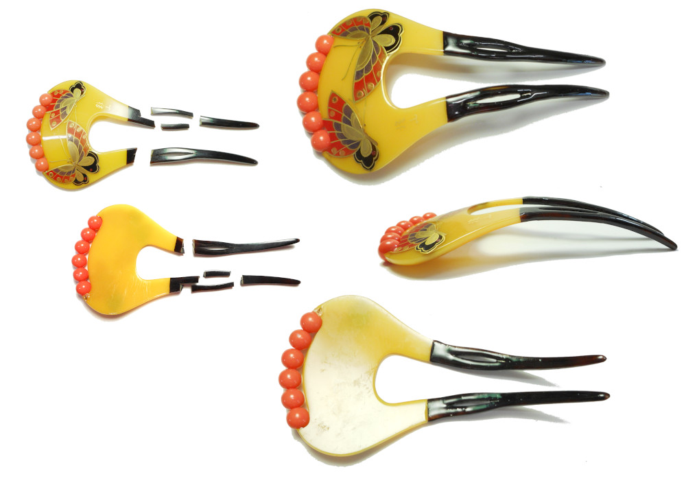 かんざしを落としまして、ご覧の通りバラバラに割れてしまいました。修理ご依頼です。色だけを診ますとべっ甲のような色をしておりますが手に取って診ますとプラスチックまたは、樹脂のようです。本当にバラバラで修理はとても大変です。裏側には透明の樹脂の板を付けまして接着を行いましての修理となりました。お客様はどうしても直して再び使用したいご希望です。接着剤の効果に時間がかかりますので、修理期間はかなり掛かりました。 参考 https://sites.google.com/site/jewelryaccessorieskousaka/home/hair-accessories...