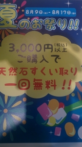 JUGEMテーマ:パワーストーン おはようございます!!山田です。今日は台風ですね、、、。早く過ぎてもらいたいですお出掛けの際には気をつけて下さいね。今日はそんな天気をふっ飛ばしちゃおう!!とイベントを行います!!3000円以上ご購入で天然石すくい取り1回無料!!これが、意外と取れるんですよジャジャーン!!こちらは9時30分から12時までの限定イベントとなっております!!ローズクォーツ、アメジスト、水晶などなど沢山入ってますよ!!明日も行っていますので是非沢山掬ってお守りとして使ってもらいたいです!!...