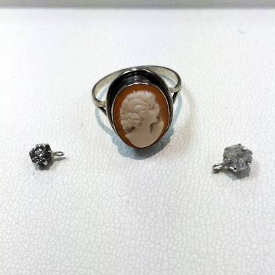 JUGEMテーマ:アクセサリー みなさんこんにちは! 先日「リングにダイヤモンドをくっつけたい!」という ご希望のお客様がいらっしゃいました! お客様はカメオのリングと、ダイヤモンドのネックレスをお持ちになって カメオの指輪の両脇にダイヤモンドのペンダントトップを取り付けられない? とのことでした。 指輪の方は、シルバー刻印・ペンダントトップはプラチナ刻印です。。 …実はシルバーとプ...