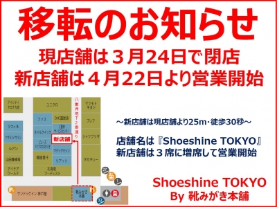 八重洲地下街店が移転します。 新しい移転先は現在の店舗から25m、徒歩で30秒離れた場所で 八重洲地下街2番通りに面しています。 席数は3席になります。もうお待たせすることもあまりないかと思います。 また、Quick Press(今すぐアイロンサービス)も展開します。 現店舗:〜3月24日(日) 新店舗:4月22日(月)〜 八重洲周辺の再開発が進み、外資系の企業が増えるということで、店名も Shoeshine TOKYO by 靴みがき本舗になります...