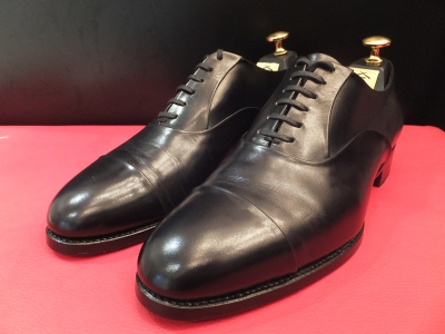 こんばんは。 初めて見るブランドのご紹介です。 スペインのブランドみたいです。 ソールが赤い靴は知っているのですが、中が赤色の靴は はじめてみました。 イタリア靴を彷彿させる細身のデザインです。 BeforeCare&Shine で潤いを与え、磨いてあげることで表情が 引き締まりました。これで細身のスーツを纏ってオフィスを 闊歩するとカッコいいでしょうねー。