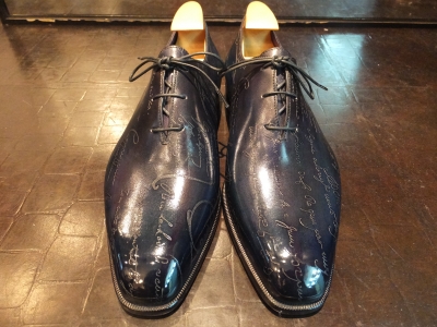 こんばんは。 今日はBerlutiです。 こんなにBerlutiも多いんだ・・・と思ったのは、 創業間もないころです。 どれもこれも、個性的で芸術性が高く、 毎回ビックリさせられています。 そんな逸品たちに出会える私たちは幸せです。 どーですか・・・この逸品。 カリグラフィーが刻まれています。Berlutiだけの技術です。 そこに紫と紺のパティーヌです。 同じものは二つとして作れません。作れないには理由があります。 なぜならば・・・ この作業はすべて人の手によるもので、 カラリストの...