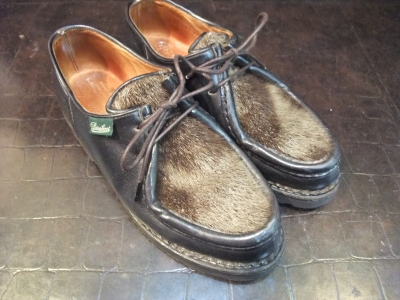 JUGEMテーマ:靴ブランド こんばんはー。 雨の日無敵のパラブーツ! 芸術性の高いフランス靴では珍しい、質実剛健の イメージがある同ブランドですが、こんな逸品が あります。 ミカエル・・・これは芸術性を追求したのか、 実用性を求めたのかわかりませんが、 雨にも強く、デザインもある意味目立つ逸品。 初めて見た時はビックリしました。 今ではアザラシの毛の入手が困難になったことから、 リス、うさぎ、ポニーなどの革も使っているようです。 基本的に皮は食用肉の副産物になりますが、リ...