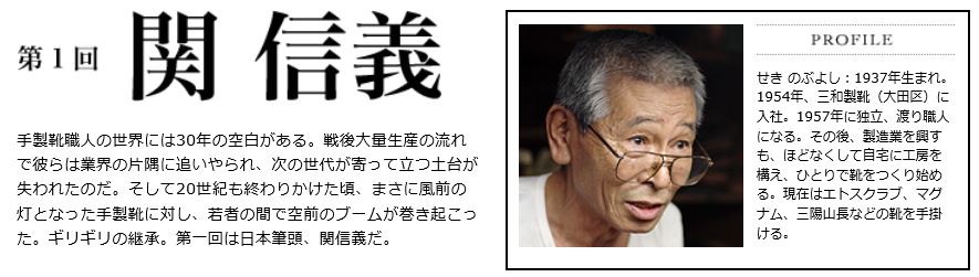こんばんはー。 今日もJL/EG/CJ/ALDENなどなど沢山遊びに来てくれました! ありがとうございます!みーんな綺麗に艶々、ピカピカに輝かせちゃいました! 写真の確認をしていたところ・・・思わず見入った写真が1枚。 今日は・・・関信義さんの作った逸品をご紹介します。 よほど靴が好きか、靴作りを学んでいる人しかしらないかもしれませんが、 日本を代表する靴職人でした(過去形?) <BOQ> この方の人生が本にもなっています。 <Amazon> 彼の名言が・・・「人の2倍・3倍...