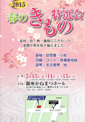 JUGEMテーマ:お着物&浴衣 三寒四温・・・ 暖かかったり急に冷えたりで、体には堪えますが 春の訪れは、もうすぐそこ・・・! 3月13日㈮、14日㈯、15日㈰の3日間、 恒例の「春のきもの特選会」を開催致します。 この催しでは、大島や牛首のほかカジュアルな普段着紬から お手頃な付下げや作家物訪問着、七五三・振袖まで あらゆるシーンでの着物をご紹介いたします。 伝統的な染織、新しい柄付、さまざまなご提案をすべく 幅広く取り揃えておりますので ぜひぜひお越しくだ...