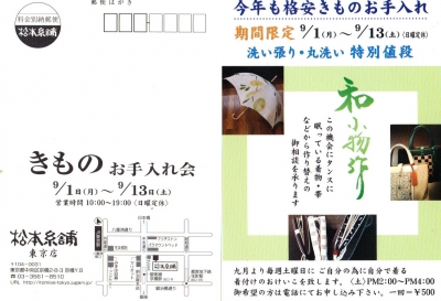 JUGEMテーマ:お着物&浴衣 お盆の東京はとっても静か。 松本糸舗のある京橋はオフィスが多いので 道行く人もまばらです。 お盆期間も日曜定休のみで頑張っておりますっ! さて、毎年恒例の「格安きものお手入れの会」を 今年も開催致します。 9月1日㈪〜13日㈯ですので、たっぷり汗をかいた夏物も このチャンスにぜひお持ちくださいね。 皆様のご来店をお待ちしております。 松本糸舗 東京店 03-3561-5810